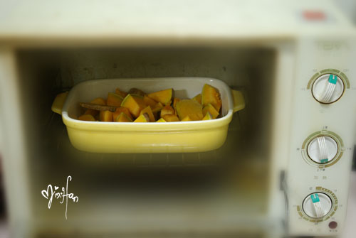 步驟二:南瓜(1)切丁,放在烤盤(B)裡,放入預熱好的烤箱(A)中烤 20 分鐘