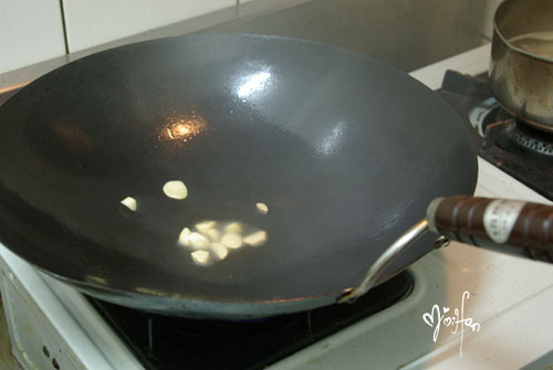 步驟五:將炒菜鍋(D)開大火,倒入橄欖油(4)適量,油熱後放入大蒜(5),稍微爆香即可,可別焦了!!!