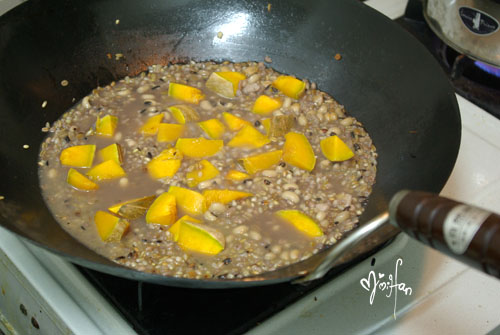 炒到湯已收乾就差不多全熟囉!!! 再稍微翻炒可讓南瓜分佈均勻...