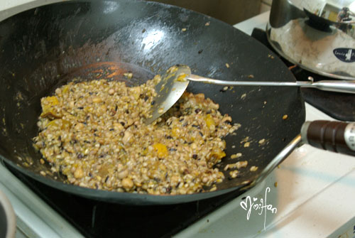 步驟十:最後一次加湯後,將已烤好的南瓜(步驟二的成果)放入一起翻炒