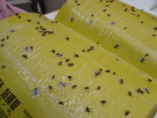 遊客中心的服務台上放著一片滿是蒼蠅的黏蠅板...