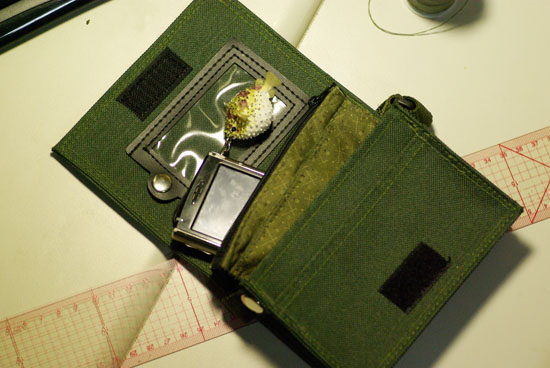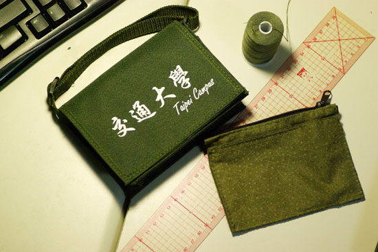 本小袋子有二層,拉鍊層可放零錢,外面那層沒拉鍊的可放紙鈔...經過二次重縫終於可以放進小書包...XD