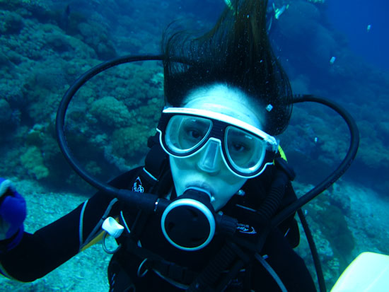 今天上岸時大浪推我了一把,害我往前跪成 囧rz,還站不起來~因為氣瓶好重~>->O