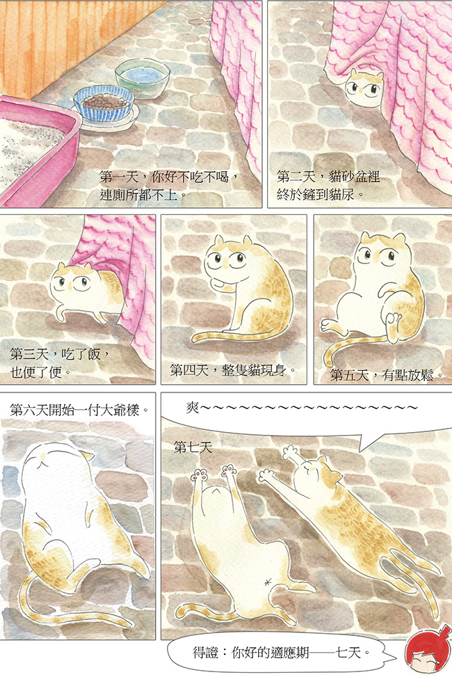 你好蜷縮在貓籃裡的身影很不安,正眼都不敢看我們一眼。網路上的養貓達人 說:「貓咪來到新環境需要幾天適應期,就讓他躲著,不要打擾。」於是我們把貓籃放在鮮少進出的倉庫,是我和阿法儲藏換季衣物和棉被的3坪左右空房間。依照達人的教導,我們都假裝你好不存在,開著倉庫門,等牠自己走出來。