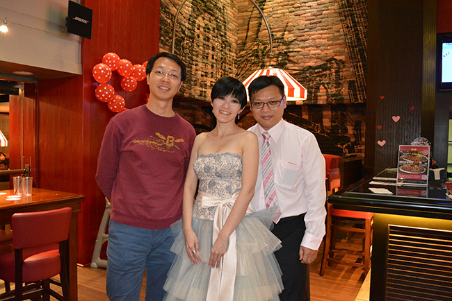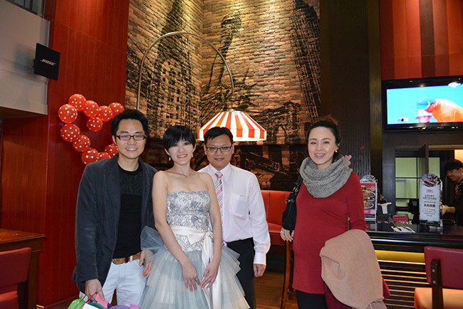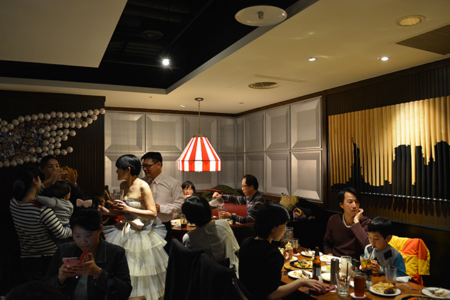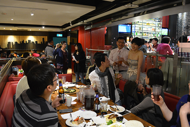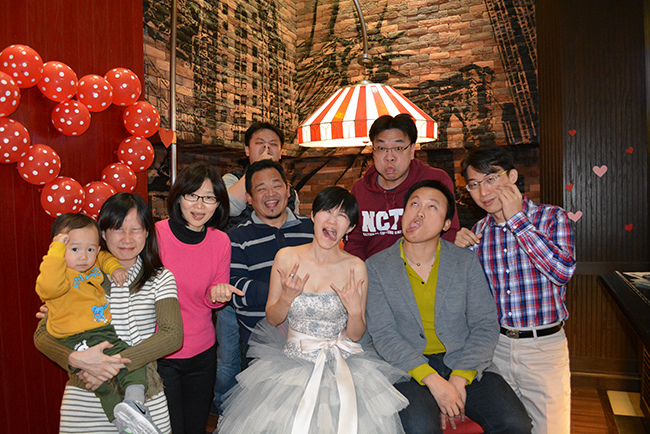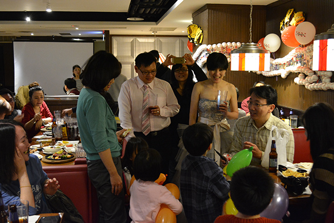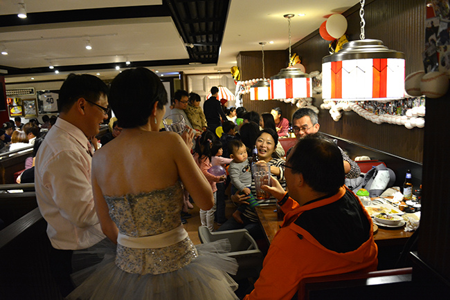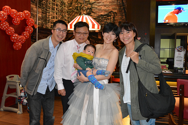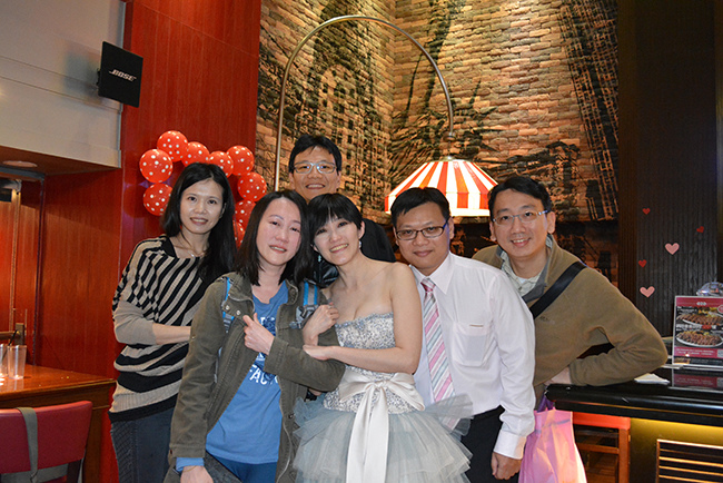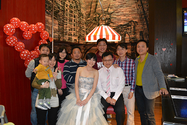 我們包了 Fridays 敦北店 B1 半邊的位置,店經理建議的,這區很不錯像半開放式的大包廂,不單有隱密性,外面吧檯區因為沒客人所以很空曠,宴會開始前親友們紛紛聚在這裡聊天,宴會散場時又聚集在這邊繼續聊,空間也很適合拍團體照,背景色調好喜氣!(這麼好的場地要吹熄燈號真是可惜!!!!!)