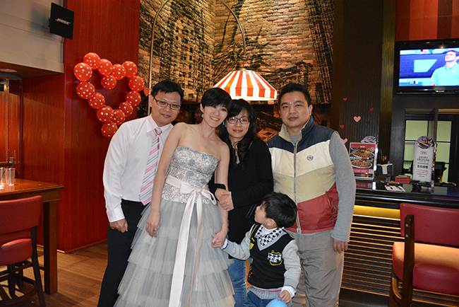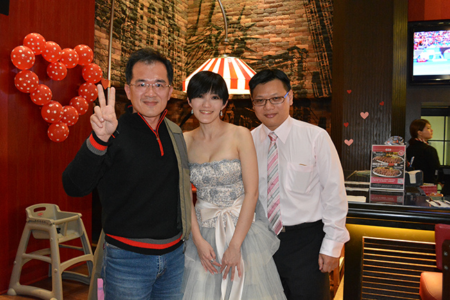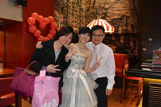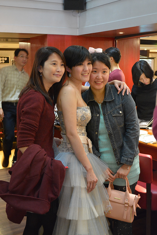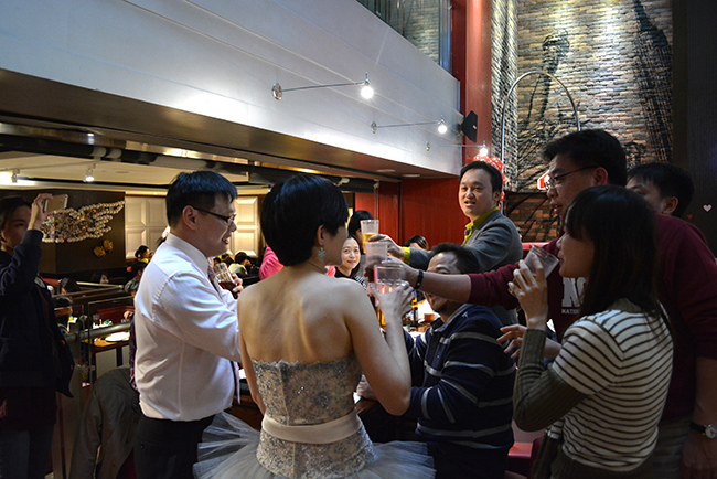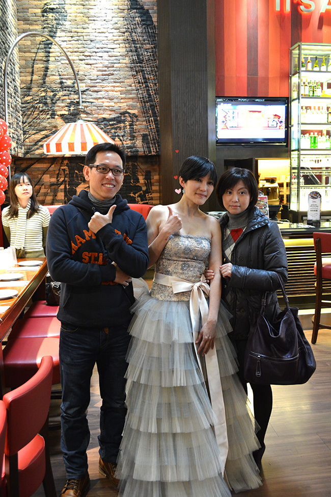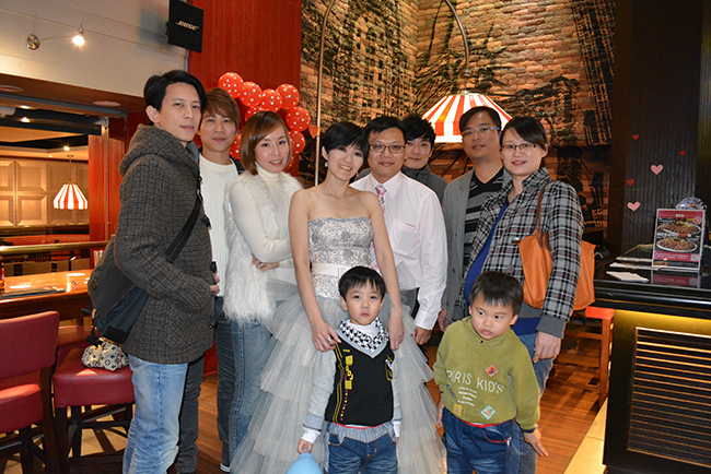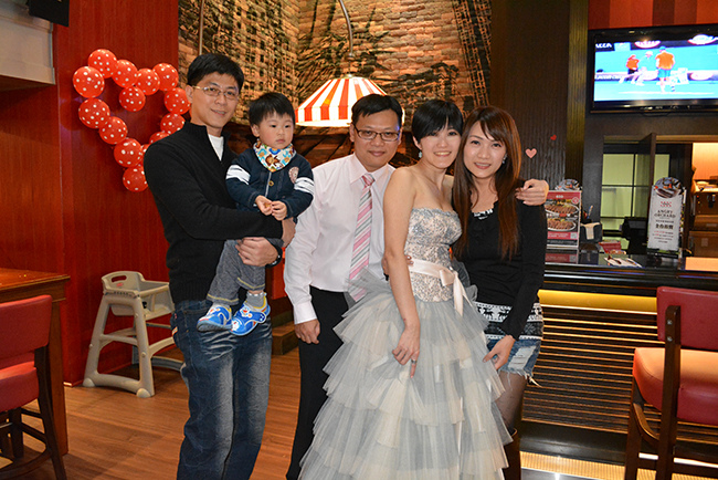 沒有儀式、沒有入場、沒有舞台、沒有燈秀、沒有換裝,單純就是溫馨的聚餐!比較隆重的是穿了禮服,11月宴客時還很合身,沒想到才過二個月竟胖二公斤,一早在 Fridays 換禮服時拉鍊還拉不起來,幸好找阿法幫忙後總算把肉都塞進去,嚇我一跳!