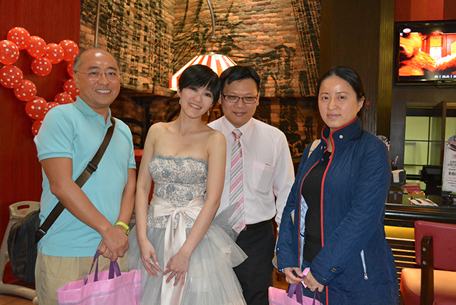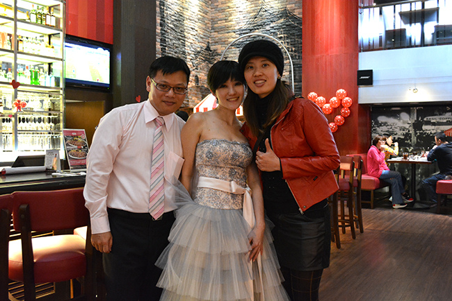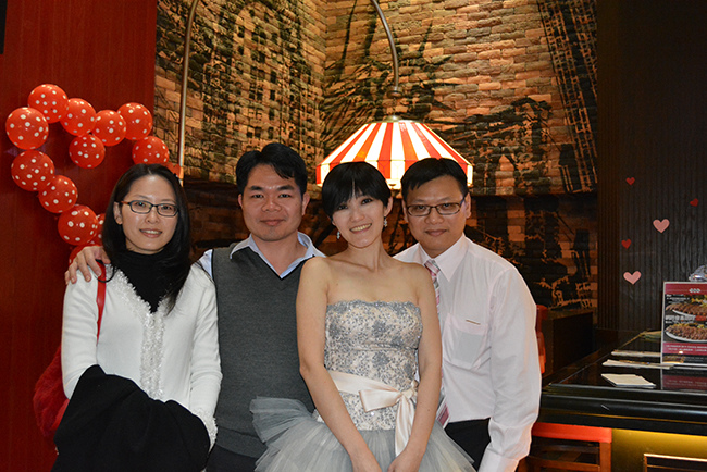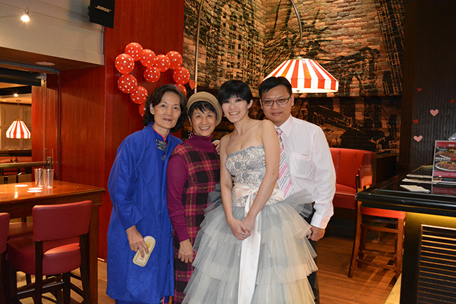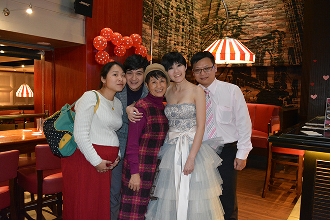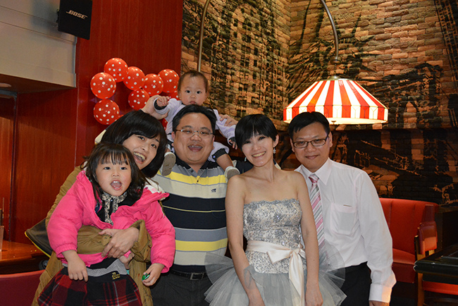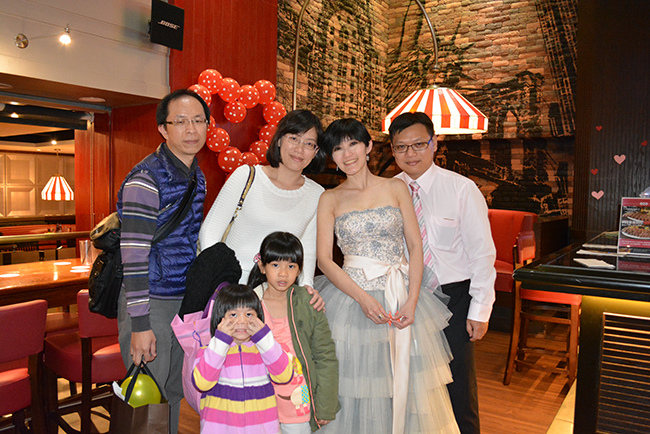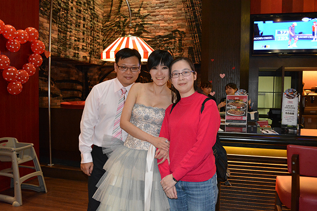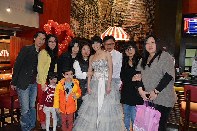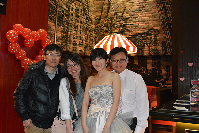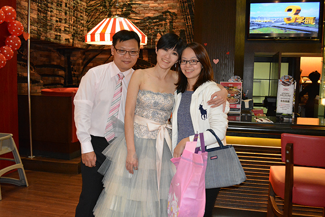 沒有儀式、沒有入場、沒有舞台、沒有燈秀、沒有換裝,單純就是溫馨的聚餐!比較隆重的是穿了禮服,11月宴客時還很合身,沒想到才過二個月竟胖二公斤,一早在 Fridays 換禮服時拉鍊還拉不起來,幸好找阿法幫忙後總算把肉都塞進去,嚇我一跳!