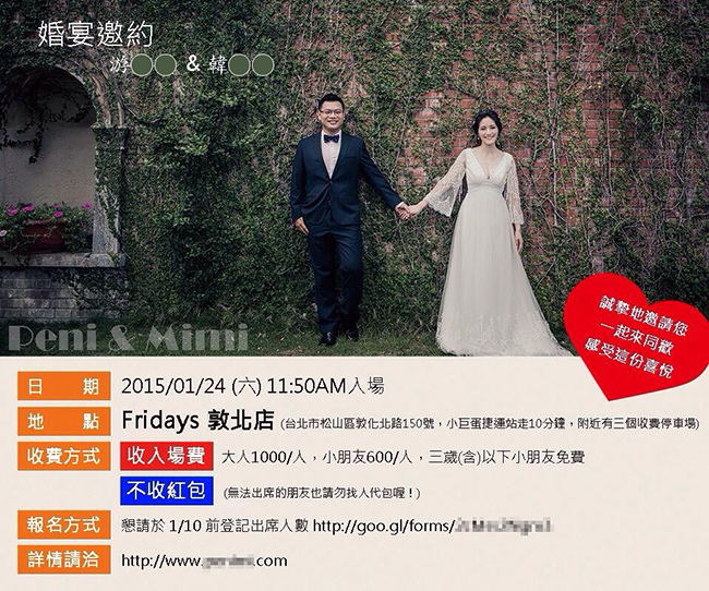 不收紅包,但是按人頭收入場費,分大人和小朋友 (只要是朋友的孩子都算小朋友,不分年齡,高中生大學生都一樣算小朋友 XD),這是我的收費方式 (如邀請函)。